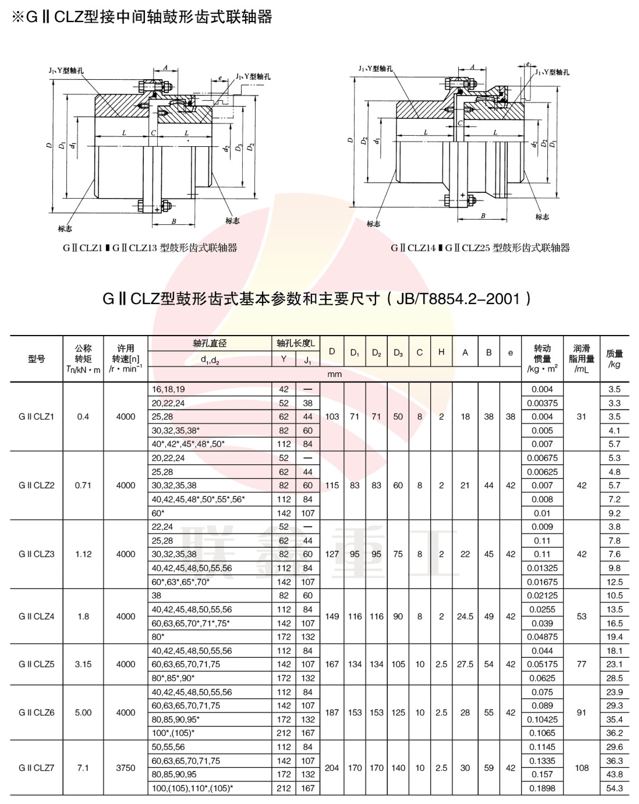 GIICLZ型鼓形齒式聯(lián)軸器 特點及應(yīng)用場合:具有少量軸線偏移補償性能,不能緩沖、減振。外形尺寸小,理論上傳遞轉(zhuǎn)矩大,需要潤滑、密封,但噪聲較大、價格貴,用于聯(lián)接水平兩同軸線軸系傳動。用于低速、重載工況條件下聯(lián)接水平兩同軸線,如冶金機械、重型機械等。不適用于高速、高精度的軸系傳動,起動頻繁、正反轉(zhuǎn)多變的工況不宜采用。