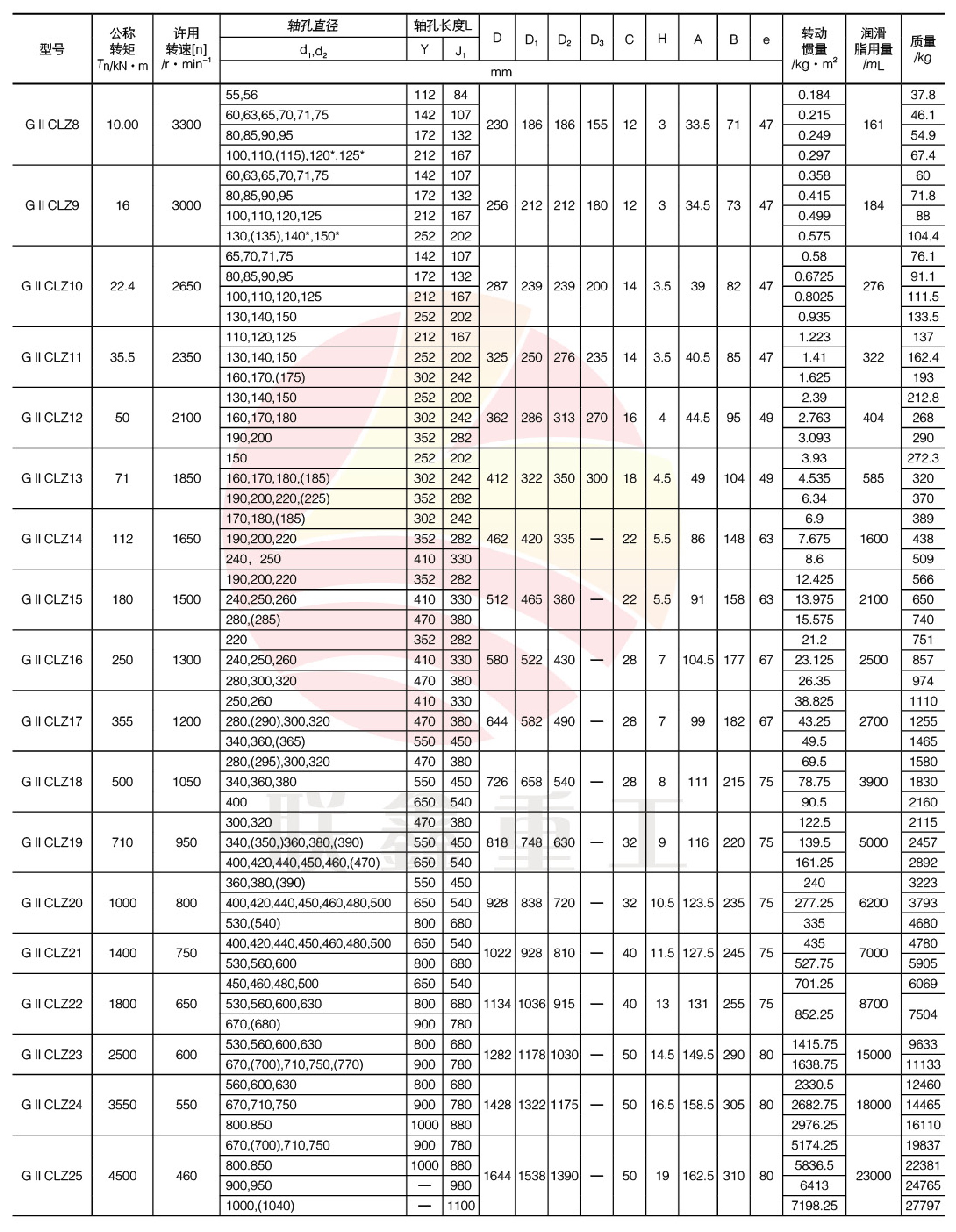 GICLZ型鼓形齒式聯(lián)軸器 特點(diǎn)及應(yīng)用場(chǎng)合:具有少量軸線(xiàn)偏移補(bǔ)償性能,不能緩沖、減振。外形尺寸小,理論上傳遞轉(zhuǎn)矩大,需要潤(rùn)滑、密封,但噪聲較大、價(jià)格貴,用于聯(lián)接水平兩同軸線(xiàn)軸系傳動(dòng)。用于低速、重載工況條件下聯(lián)接水平兩同軸線(xiàn),如冶金機(jī)械、重型機(jī)械等。不適用于高速、高精度的軸系傳動(dòng),起動(dòng)頻繁、正反轉(zhuǎn)多變的工況不宜采用。
