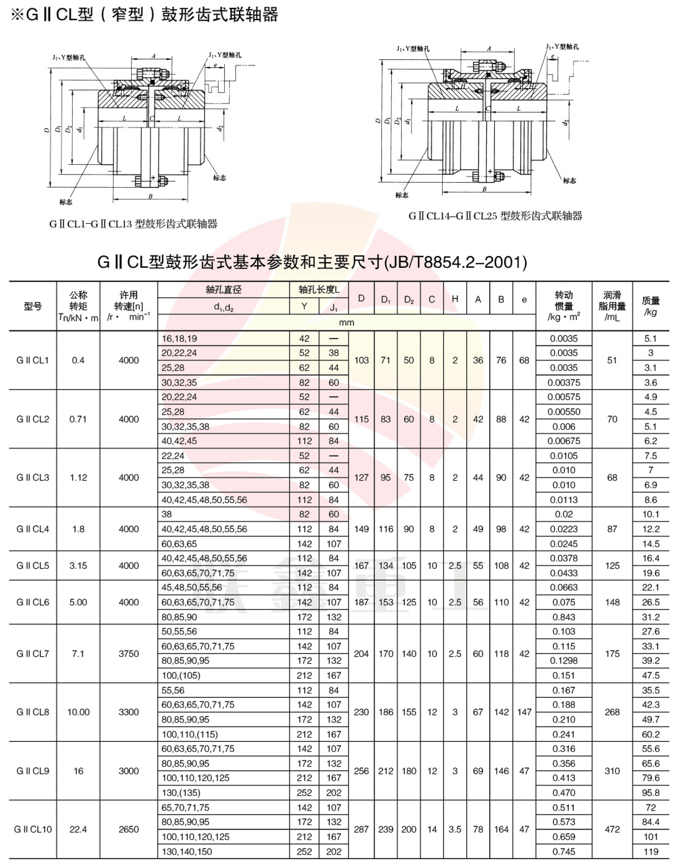 GIICL型鼓形齒式聯(lián)軸器 特點(diǎn)及應(yīng)用場(chǎng)合:具有少量軸線偏移補(bǔ)償性能,不能緩沖、減振。外形尺寸小,理論上傳遞轉(zhuǎn)矩大,需要潤(rùn)滑、密封,但噪聲較大、價(jià)格貴,用于聯(lián)接水平兩同軸線軸系傳動(dòng)。用于低速、重載工況條件下聯(lián)接水平兩同軸線,如冶金機(jī)械、重型機(jī)械等。不適用于高速、高精度的軸系傳動(dòng),起動(dòng)頻繁、正反轉(zhuǎn)多變的工況不宜采用。