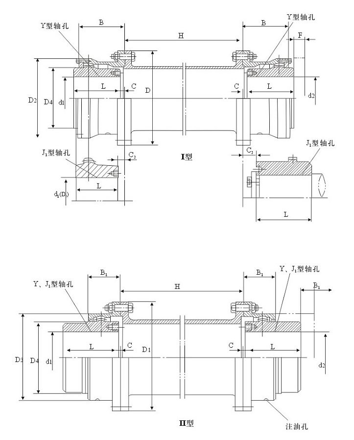 I型--密封端蓋為分離型,齒間距較大,可以允許較大的徑向位移,可與Y、J1、Z1型軸伸聯(lián)接;