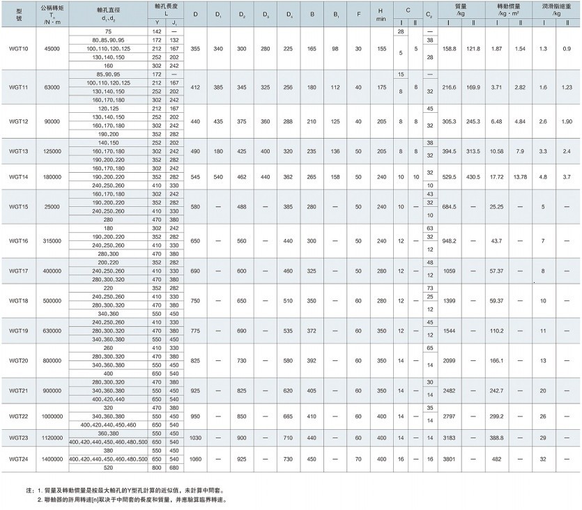 WGT型--接中間套型,適用于兩軸長距離聯(lián)接,許用轉(zhuǎn)速[n]取決于中間套的長度和質(zhì)量,并應(yīng)驗算臨界轉(zhuǎn)速;