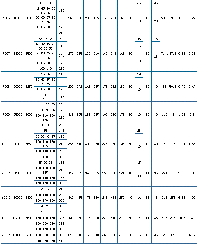WGT型--接中間套型,適用于兩軸長距離聯(lián)接,許用轉(zhuǎn)速[n]取決于中間套的長度和質(zhì)量,并應(yīng)驗(yàn)算臨界轉(zhuǎn)速;