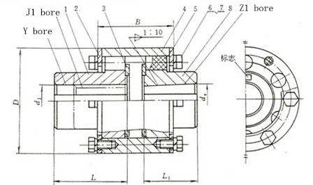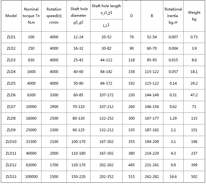 The LZD type elastic pin gear coupling is made according to the standard of GB/T5015-2003; the working temperature is -20~70°C; the axial compensation amount is ±1.5~3mm; the radial allowable compensation is 0.3~1.5mm; the angular tolerance is 0.5°. In addition, the biggest difference between the ZL (now LZ) type elastic pin gear coupling and the LZD type elastic pin gear coupling is that the LZD type pin gear coupling allows the shaft hole of one end of the coupling to be tapered. hole