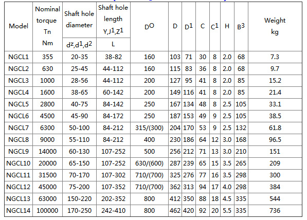 Features and applications: With a small amount of axial offset compensation performance, can not buffer, reduce vibration. The outer shape is small, theoretically, the transmission torque is large, and it needs lubrication and sealing, but the noise is large and the price is expensive, and it is used for connecting the horizontal two coaxial line shaft transmission. It is used to connect two horizontal coaxial lines under low speed and heavy load conditions, such as metallurgical machinery and heavy machinery. It is not suitable for high-speed, high-precision shafting transmission. It is not suitable to use frequent starting and reverse rotation. For use with brakes, for metallurgical machinery and heavy machinery requiring braking components NGCL type - basic type with brake wheel; NGCLZ type - with brake wheel connected intermediate shaft type; ![]() ![]() |