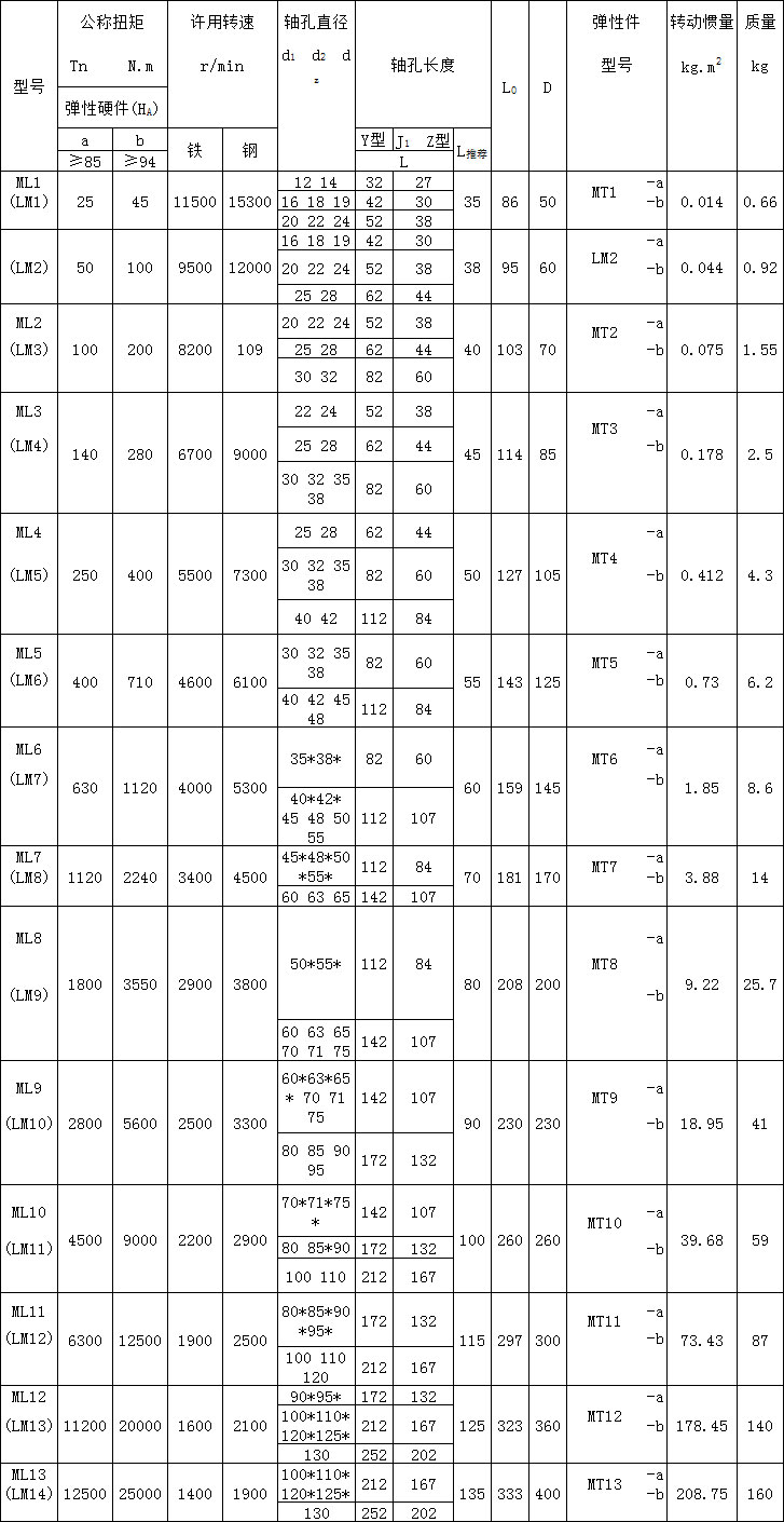 ML(LM)型梅花形彈性聯(lián)軸器的參數(shù)及主要尺寸:(GB/T 5272-2002) mm