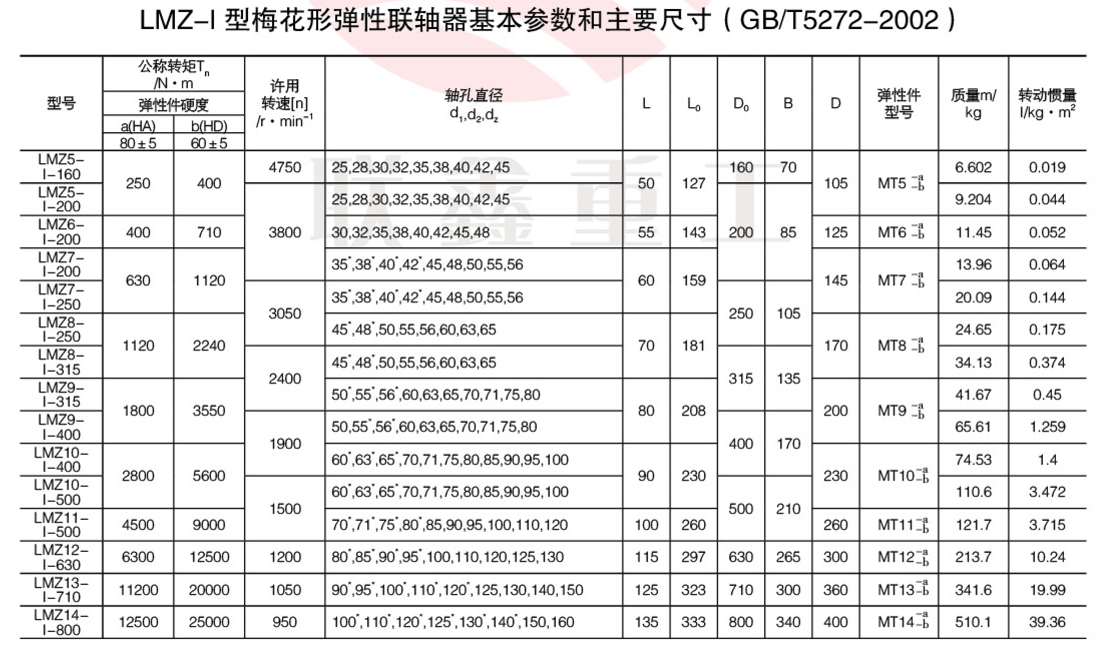 MLL-I(LMZ-I)梅花聯(lián)軸器 特點(diǎn)及應(yīng)用場合:具有補(bǔ)償兩軸相對(duì)偏移、減振、緩沖性能、徑向尺寸小,結(jié)構(gòu)簡單、不用潤滑、承載能力較高,維護(hù)方使、更換彈性元件需軸向移動(dòng) (MLS型除外),適用于聯(lián)接同軸線,起動(dòng)頻繁,正反轉(zhuǎn)變化,中速、中等轉(zhuǎn)矩傳動(dòng)軸系和要求工作可靠性高的工作部位。不適用于重載、低速及軸向尺寸受艱制,更換彈性元件后兩軸對(duì)中困難的部位。