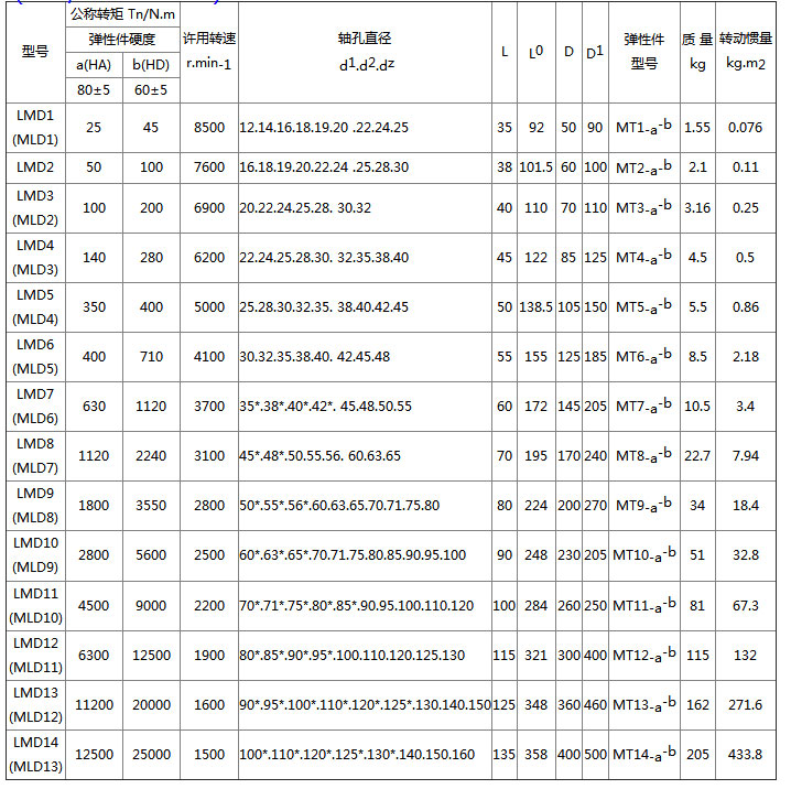 MLD(LMD)梅花彈性聯(lián)軸器 特點(diǎn)及應(yīng)用場合:具有補(bǔ)償兩軸相對(duì)偏移、減振、緩沖性能、徑向尺寸小,結(jié)構(gòu)簡單、不用潤滑、承載能力較高,維護(hù)方使、更換彈性元件需軸向移動(dòng) (MLS型除外),適用于聯(lián)接同軸線,起動(dòng)頻繁,正反轉(zhuǎn)變化,中速、中等轉(zhuǎn)矩傳動(dòng)軸系和要求工作可靠性高的工作部位。不適用于重載、低速及軸向尺寸受艱制,更換彈性元件后兩軸對(duì)中困難的部位。