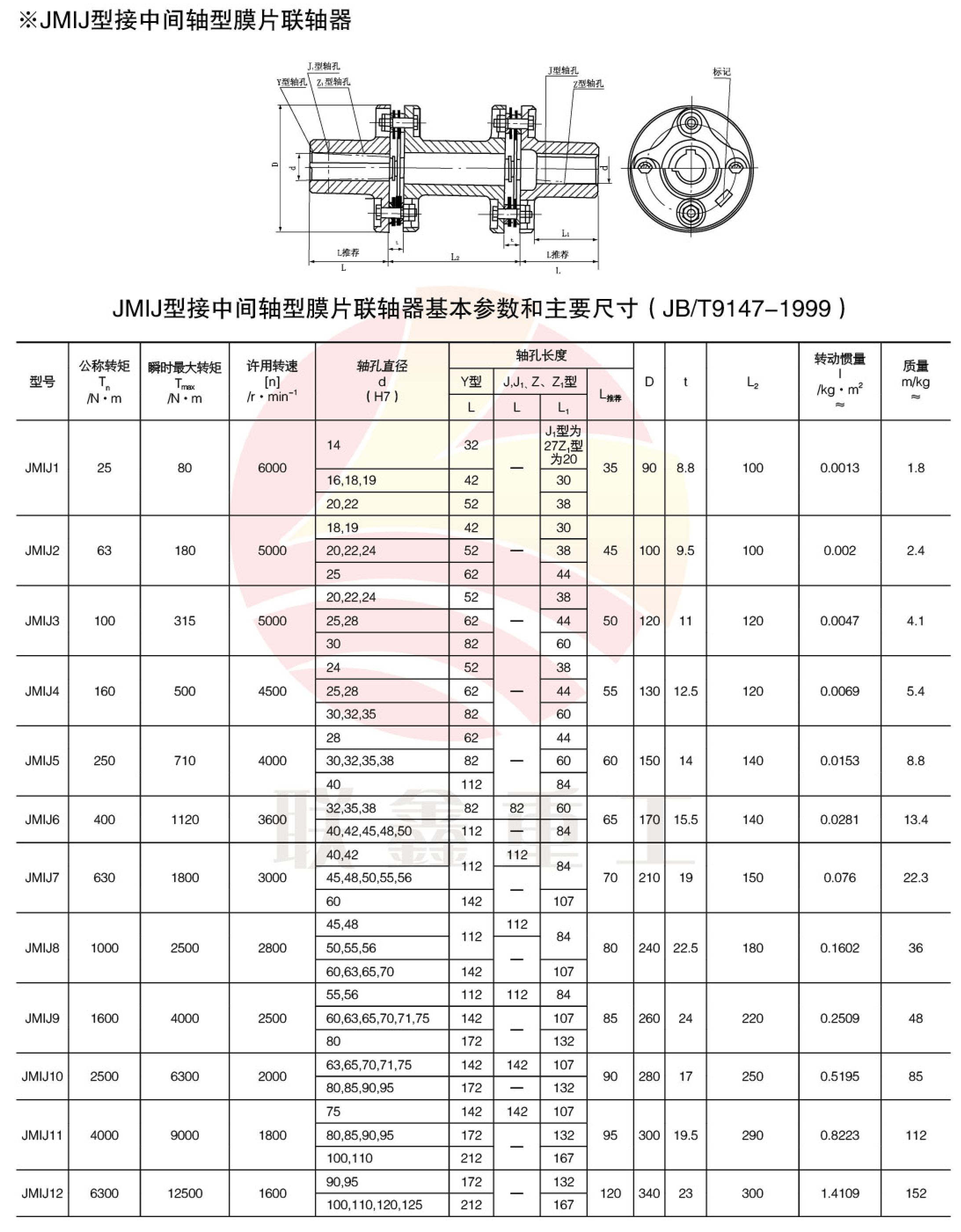 JMIJ膜片聯(lián)軸器 特點及應(yīng)用場合:與金屬彈性元件撓性聯(lián)軸器相比,具有機械強度高,承載能力大、質(zhì)量輕結(jié)構(gòu)尺寸小、傳動效率和傳動精度高,可靠性好、裝拆方便等特點。適用于中、高速、大轉(zhuǎn)矩軸系傳動。與鼓形齒式聯(lián)軸器相比,具有無相對滑動,不需潤滑,使用壽命長、無噪聲、結(jié)構(gòu)簡單等特點.可部分代替鼓形齒式聯(lián)輔器。不受溫度和油污影響。具有耐酸、堿,防腐蝕的特點??捎糜诟邷亍⒌蜏睾陀杏?、有水和腐蝕介質(zhì)的工況環(huán)境.適用于各種機械裝置載荷變化不大的軸系傳動,通用性極強,工業(yè)發(fā)達國家已普遍采用,是我國重點推廣應(yīng)用的高性能撓性聯(lián)軸囂,高精度膜片聯(lián)軸器可用于高速工況。膜片聯(lián)軸器與齒式聯(lián)軸器相比,沒有相對滑動,不需要潤滑、密封,無噪聲,基本不用維修,制造較方便,可部分代替齒式聯(lián)軸器。膜片聯(lián)軸器在工業(yè)發(fā)達國家應(yīng)用已很普遍,在實際應(yīng)用中一般采用接中間軸型,以提高兩軸線偏移補償性能。