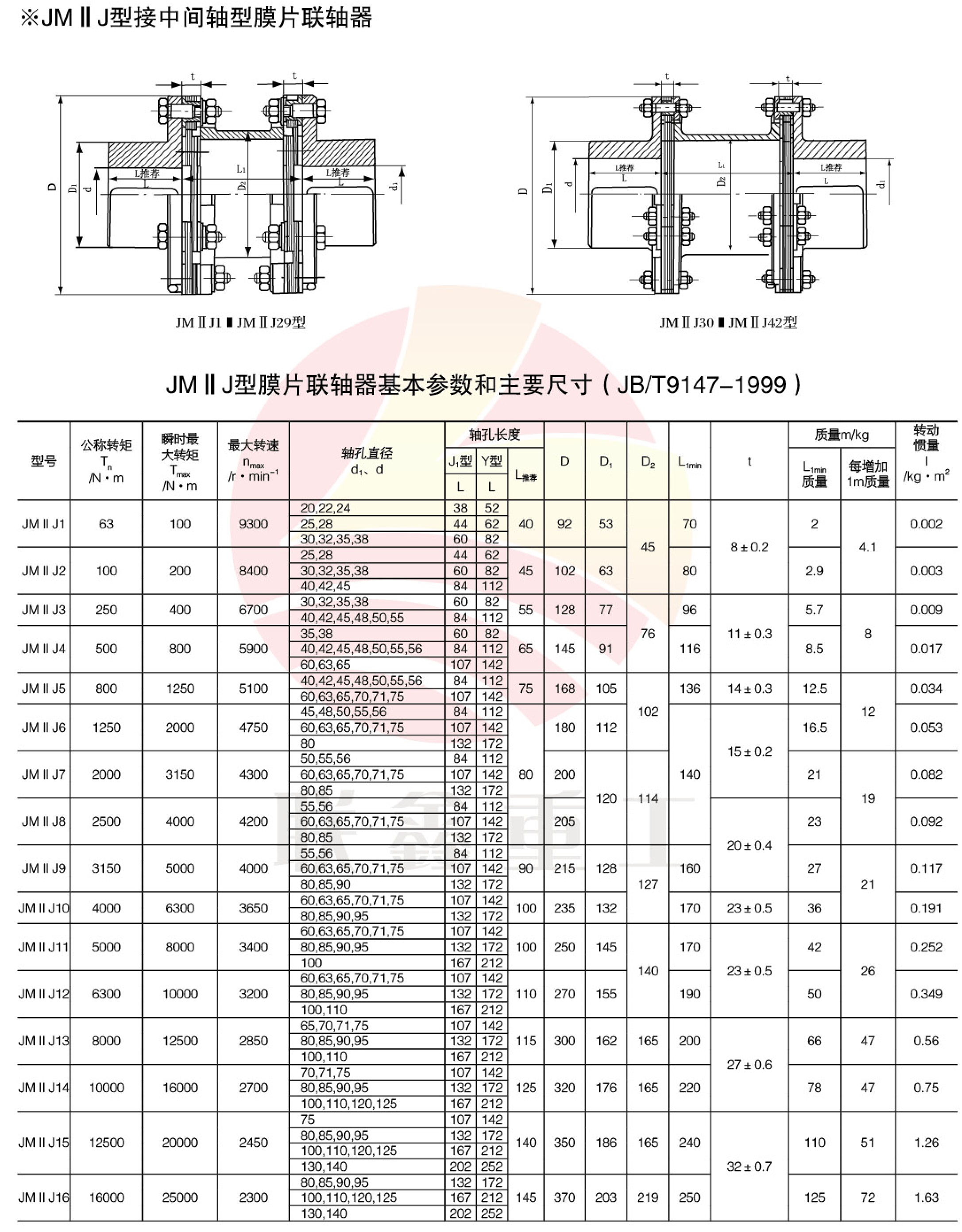 JMⅡJ膜片聯(lián)軸器 特點(diǎn)及應(yīng)用場(chǎng)合:與金屬彈性元件撓性聯(lián)軸器相比,具有機(jī)械強(qiáng)度高,承載能力大、質(zhì)量輕結(jié)構(gòu)尺寸小、傳動(dòng)效率和傳動(dòng)精度高,可靠性好、裝拆方便等特點(diǎn)。適用于中、高速、大轉(zhuǎn)矩軸系傳動(dòng)。與鼓形齒式聯(lián)軸器相比,具有無相對(duì)滑動(dòng),不需潤滑,使用壽命長、無噪聲、結(jié)構(gòu)簡單等特點(diǎn).可部分代替鼓形齒式聯(lián)輔器。不受溫度和油污影響。具有耐酸、堿,防腐蝕的特點(diǎn)。可用于高溫、低溫和有油、有水和腐蝕介質(zhì)的工況環(huán)境.適用于各種機(jī)械裝置載荷變化不大的軸系傳動(dòng),通用性極強(qiáng),工業(yè)發(fā)達(dá)國家已普遍采用,是我國重點(diǎn)推廣應(yīng)用的高性能撓性聯(lián)軸囂,高精度膜片聯(lián)軸器可用于高速工況。膜片聯(lián)軸器與齒式聯(lián)軸器相比,沒有相對(duì)滑動(dòng),不需要潤滑、密封,無噪聲,基本不用維修,制造較方便,可部分代替齒式聯(lián)軸器。膜片聯(lián)軸器在工業(yè)發(fā)達(dá)國家應(yīng)用已很普遍,在實(shí)際應(yīng)用中一般采用接中間軸型,以提高兩軸線偏移補(bǔ)償性能。