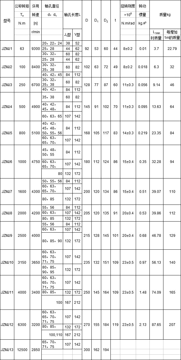 JZMJ型重型機械用膜片聯(lián)軸器的參數(shù)及主要尺寸: (JB/ZQ 4717-98) mm