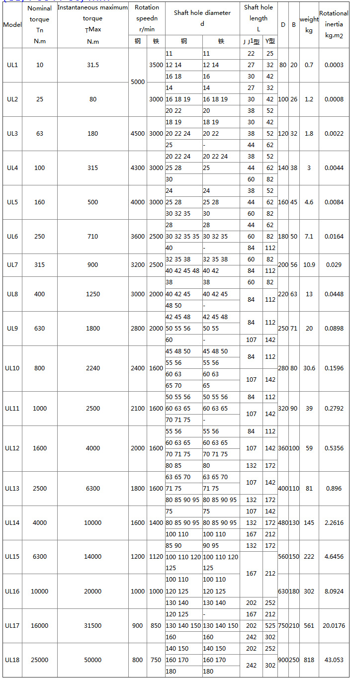 UL type tire couplings Features and applications: high elasticity, low torsional stiffness, strong vibration damping capacity, large compensation, good damping, simple structure, no lubrication, easy assembly and disassembly. The noise is small, the radial dimension is large, the bearing capacity is low, and the large axial additional load is generated during the overload. The service life depends on the quality of the rubber product, and is suitable for the shafting transmission with frequent starting, positive and negative reversal, and large impact vibration. It can work under dust and water conditions, and it is not suitable for high temperature, high speed, high torque and low speed and heavy load conditions.